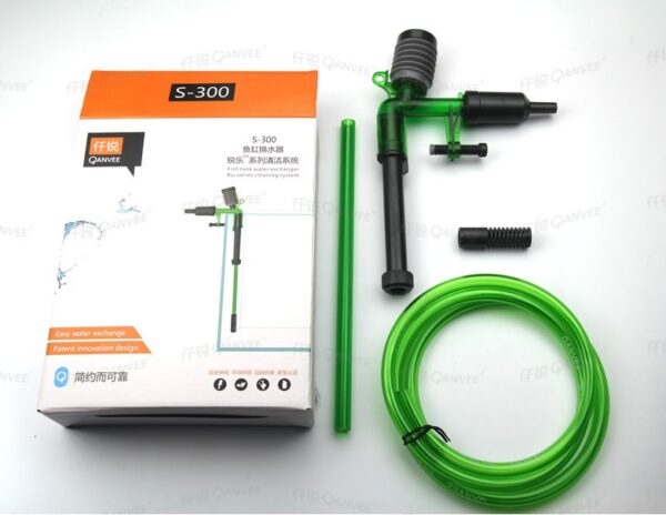 Qanvee aquarium water siphon for water exchange and cleaning of aquarium tank. Easy use manual pump initiates siphon of tank water for quick and easy water changes.