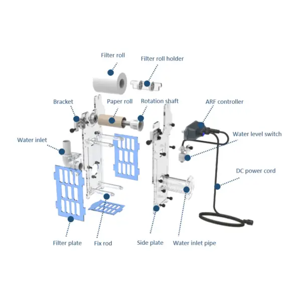 - Automatic Fleece Advancement: Equipped with a float switch that detects rising water levels due to clogging, triggering the motor to advance the fleece roll, ensuring continuous filtration.