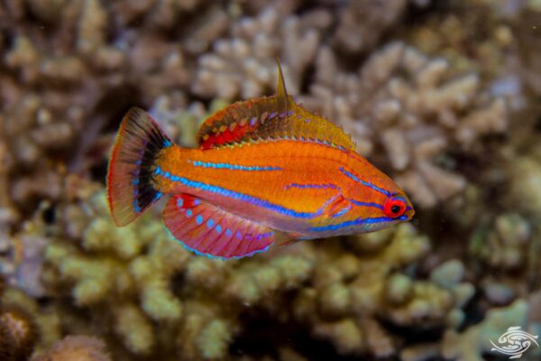 The McCosker’s Flasher Wrasse is an attractive reef-safe wrasse sure to be the star of your aquarium. This hardy wrasse species adapts well to established home aquariums, making it a beautiful and active addition. The vibrantly colored male McCosker’s Flasher Wrasse is predominantly red/orange with blue, horizontal stripes that complement its yellow stomach. The orange dorsal fin is accented with red, yellow, and blue and features a single elongated ray. A gorgeous, red band across the orange anal fin creates an impressive and bold color palette. The female coloration and overall appearance is more subdued. The females also do not feature the large dorsal and anal fins.